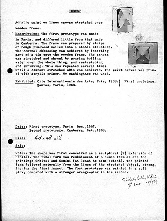 This Note is the original sheet detailing the wotk Thrust 1967. Three protoypes were created. The first in Paris, the second in Canberra and the third in Wagga Wagga.