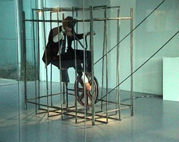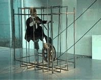 The idea of the artist trapped in a cage endlessly cycling to turn the wheel located way outside of his grasp appealed to me. Yes, there are also shades of one of Samuel Beckett's characters embedded here.