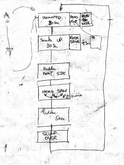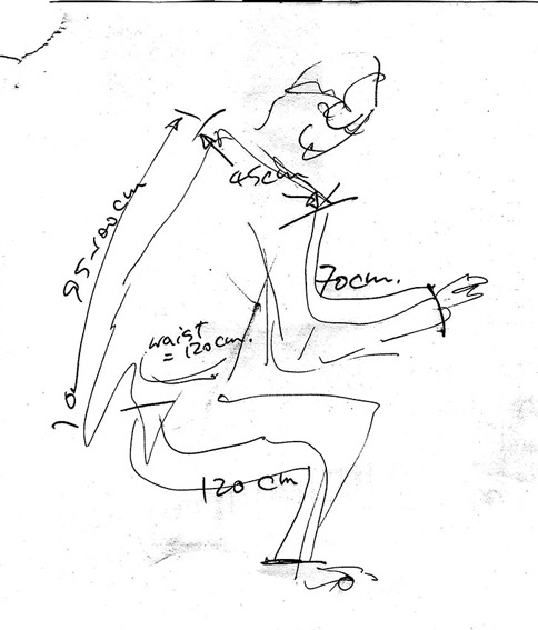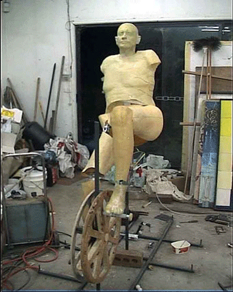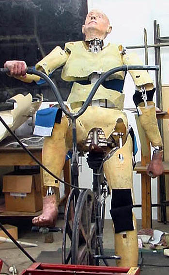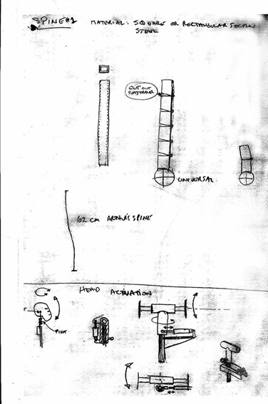 Preliminary sketches that envisage the final installation. The initial idea of creating an automated robotic cyclist then encompassed detailed problems associated with the joints and articulation of the spine, head and legs. Movement of the spine in particular involved input from Ken Myer the electronic engineer, Russell Emmerson of the Centre for Performance Studies at Sydney University and the artist.