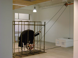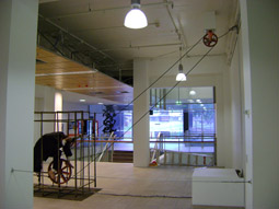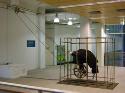 Showing the full installation: cyclist, cage and ceiling pulley wheel with extended belt. |