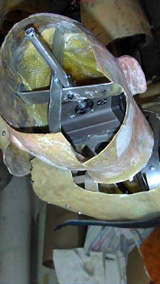 Now the skeletal joints have been connected; the pneumatic pistoms installed & connected, the micro computer and software installed, the fibreglass skin sections attached;