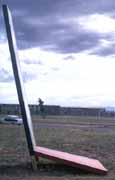 Constructed from masonite attached to a 4 x 2 wooden structure; the base wooden supports driven deep into the soil for stability over its 2 month life. Surface painted with rubber based paving paint.