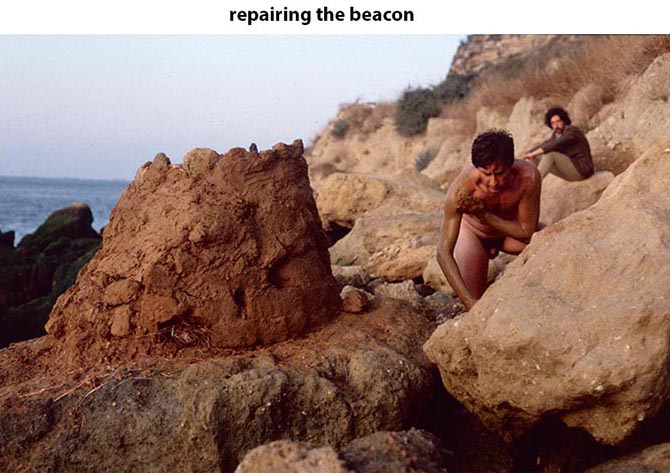 The performance was based on my conversion from an atavistic creature to a cultured and civilised one that could be seated with the immaculate Carlos. So the performance started with me stark naked and still rubbing clay over the structure and then rubbing in the same fashion over my body until it was covered and completely red. I then ignited the beacon and fed it periodically with my scraps of wood. It blazed away with great While naked, covered with the red clay I would hide myself among the rocks near the water’s edge. These rocks covered with a small green weed which was very slippery and I had to take great care with bare feet off the slip over and damage myself. So the process of hiding darting around the rocks and periodically emerging to feed the furnace which at that point the generating a fair degree of heat.