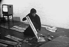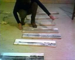 As a foil to the "external" experiences, an "internal" studio performance was developed using a highly ritualised activity where the Broome Street environment was laid out on the studio floor in intricate detail then discarded; to be replaced by miniature objects developed from the Durras sand dunes experience. The studio performance mirrored the external performances but in a tighter more contained space. This was videoed on colour U-Matic equipment. | |