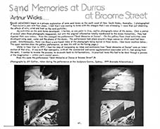 Sand memories is a complex series of works which began in 1975. It originated on the beach and sand dunes of Durras on the New South Wales South Coast. A specific and prominent set of sand dunes were selected as the base of the work. The entirety of the selected sand dune system was photographed as a series of static images assembled as a single panoramic statement. Between 1975 and 1978 this same set of sand dunes was re-photographed into panoramic images to record their response to the effect of weathering. Photographic prints of the resulting nine panoramic images were glued onto thin board and in 1978 these boards were buried into the sand dunes themselves. In a metaphorical sense the sand dunes were digesting their own history. |