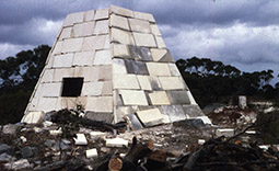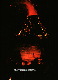 David Hansen's observations. In 1988, in an abandoned limestone quarry in Mt Gambier, he built two chimneys, the largest a two and a half metre pyramid above an old lime kiln. These were stuffed with dry leaves and branches from the surrounding scrub, and were to be ignited as part of a performance in which the artist, dressed in a suit and with his face immobilised by a mud mask, "recited" a paranoid-prophetic-luddite Armageddon monologue, through a cassette player in his pocket and a small speaker in his lapel. As it happened, the performance was scheduled at the end of a dry summer, on the final day of a period of fire bans. until the last minute it seemed possible that the district council would deny permission; in the event the performance had to be attended by two local fire units. Not only was permission finally granted, but in addition to the pyro drama of Wicks' blazing Volcanoes and other primal vents and the eco-psychodrama of his rant, we also got the theatre spots of the fire trucks' headlights, the yellow strobe of the flashing lights on their roofs and the pumps and extras of throbbing engines, large machines and men in hard hats and orange overalls. Behind the pre-recorded tinny demagoguery issuing from the artist's suit, fire service radios crackled. All of these additional special effects were unplanned, but perfectly in harmony with the performance's mood and metaphors. Arthur Wicks is lucky.